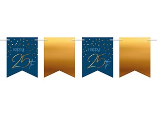 Elegancki baner przeznaczony na 25 urodziny w postaci flag z napisem Happy 25th w cudownej niebiesko-złotej kolorystyce. Zestaw składa się z 10 flag o wysokości 23 cm zawieszonych na sznurku o długości 6m. Taka ozdoba niewątpliwie wzbogaci wystrój przyjęcia urodzinowego.