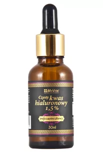 OPIS Czysty kwas hialuronowy 1,5% trójcząsteczkowy MyVita Kwas hialuronowy MyVita(R) to trójcząsteczkowe serum aktywnie pielęgnujące skórę z potrójną siłą. Jego wszechstronne działanie opiera się na różnej budowie poszczególnych cząsteczek. W preparacie występują 3 rodzaje kwasu o różnej masie cząsteczkowej. Dzięki temu działa na powierzchni skóry, w jej głębszych warstwach, a dodatkowo zwiększa wchłanianie innych substancji aktywnych w głąb skóry. Kwas hialuronowy to substancja naturalnie występująca w organizmie człowieka, z czego aż połowa znajduje się w skórze właściwej oraz w przestrzeni międzykomórkowej.