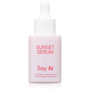 Twoja skóra odzyska blask – poznaj skoncentrowane serum na noc Say Hi Sunset z 15% kompleksem wielokwasowym dla poprawy kondycji skóry!Zaawansowane serum kwasowe kompleksowo złuszczające i stymulujące odnowę komórkową na noc. Jego starannie dobrana, skoncentrowana formuła zawiera skuteczny, a zarazem bezpieczny dla cery wrażliwej, 15% kompleks kwasów, który nie tylko złuszcza, ale także rozjaśnia, poprawia elastyczność i nawilżenie skóry. Przyspiesza jej naturalną zdolność do regeneracji, stymul
