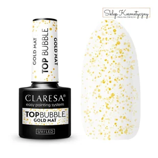 Transparentny matowy top ze złotymi drobinkami Bubble Gold Matt No Wipe będzie prezentować się świetnie na każdym lakierze hybrydowym, niezależnie od tego, czy masz na paznokciach jednolity kolor, baby boomera, czy też ombre. Zatopione w produkcie drobinki różnią się wielkością i kształtem, dzięki czemu Twój manicure stanie się jeszcze bardziej wielowymiarowy, a matowe wykończenie nada mu elegancji.