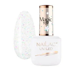NaiLac Magic Top to top hybrydowy z drobinkami brokatu i confetti, który nadaje każdemu manicure trójwymiarowy, trwały blask bez konieczności przemywania i gwarantuje perfekcyjne wykończenie w magicznym stylu.