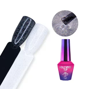 Top no wipe Hollywood MollyLac Star do lakierów hybrydowych z drobinkami 10 g Jeśli szukasz nieoczywistych rozwiązań i wyjątkowego blasku - przedstawiamy naszą perełkę! Top do lakierów hybrydowych, żelowych, akrylożelu i innych pochodnych o ekstremalnej wytrzymałości, a także pięknym blasku dzięki pięknym mikro drobinkom. Nadaj pięknego wyglądu dzięki drobinie, a także ciesz się ekstremalnie mocną i wytrzymałą stylizacją bez zarysowań. Jeden produkt dwa zastosowania! Jeśli Twoje klientki lubią błyszczące efekty w swoich stylizacjach, ale nie lubisz tracić czasu na nakładanie pyłków - pokochasz nasz top! Top Hollywood nie posiada warstwy dyspersyjnej, dzięki czemu skrócisz czas pracy do minimum. Średnio gęsta konsystencja zapewni komfort pracy i zminimalizuje ryzyko zalania skórek. Stosuj go według swoich upodobań - nakładaj na wszystkie paznokcie, na jeden lub tylko na część stylizacji tworząc bardzo delikatny wzór.