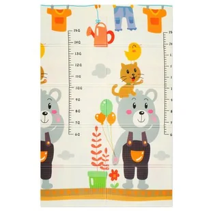 Atrakcyjne kolory maty sprawią, że stanie się ona estetycznym elementem wystroju każdego wnętrza. Na jednej stronie znajduje się grafika przedstawiająca uśmiechnięte kotki i miarkę pozwalającą na zmierzenie wzrostu dziecka. Druga strona maty zawiera grafikę z kolorowymi uliczkami i pojazdami. DO DOMU I NA ZEWNĄTRZ Mata jest idealna do nauki raczkowania i chodzenia oraz jako bezpieczne miejsce do zabawy. Dzięki swojej grubości jest ciekawą alternatywą dywanu oraz bezpieczną izolacją od zimnej i twardej podłogi.