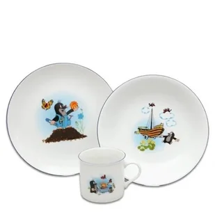 3-częściowy porcelanowy zestaw z wesołym motywem Krecika zachwyci wszystkie dzieci. Zawiera płytki talerz, głęboki talerz typu miska i kubek. Wszystko w wygodnym rozmiarze w sam raz do dziecięcych posiłków. Zestaw wykonany jest z wysokiej jakości czeskiej porcelany. Zapakowany w piękne pudełko prezentowe.