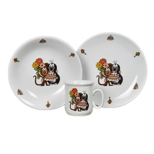 3-częściowy porcelanowy zestaw z wesołym motywem Krecika zachwyci wszystkie dzieci. Zawiera płytki talerz, głęboki talerz typu miska i kubek. Wszystko w wygodnym rozmiarze w sam raz do dziecięcych posiłków. Zestaw wykonany jest z wysokiej jakości czeskiej porcelany. Zapakowany w piękne pudełko prezentowe.
