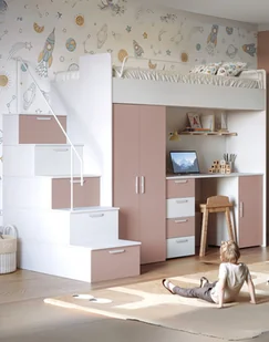 - łóżko piętrowe (na górze) ze stelażem i materacem,- biurko z szufladami i szafką (w centralnej części),- pojemną szafę ubraniową,- praktyczne schody z szufladami w stopniachObciążenie górnego łóżka wynosi do 75 kg.