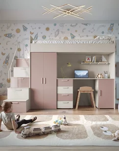 - łóżko piętrowe (na górze) ze stelażem i materacem,- biurko z szufladami i szafką (w centralnej części),- pojemną szafę ubraniową,- praktyczne schody z szufladami w stopniachObciążenie górnego łóżka wynosi do 75 kg.