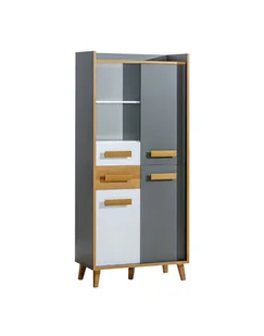 Regał zamykany z półkami Werso W3 łączy nowoczesność z funkcjonalnością, tworząc idealne rozwiązanie dla współczesnych wnętrz. Regał przyciąga wzrok od pierwszego spojrzenia dzięki oryginalnemu połączeniu kolorów. Głęboka szarość, czysta biel i ciepły odcień naturalnego drewna tworzą harmonijną kompozycję. Drewniane uchwyty i nóżki dodają regałowi przytulności i lekkości, a całość osadzona jest na stabilnej podstawie o delikatnie zwężanych nogach, charakterystycznych dla stylu skandynawskiego. Werso W3 to mebel wielozadaniowy.