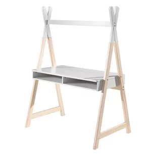 Biurko dziecięce w stylu namiotu tipi. Szykowne i niezwykłe jednocześnie, z praktyczną funkcją do pokoju dziecięcego. Biurko wykonane jest z wysokiej jakości płyty MDF, pomalowanej na biało. Rozpórki namiotu tipi po bokach są wykonane z naturalnego drewna sosnowego. Górna część jest umieszczona na górze i pomalowana na biało.