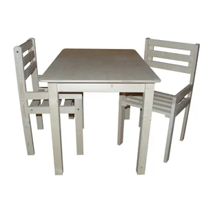 Komplet składa się ze stolika oraz dwóch krzesełek. Wykonany został z drewna świerkowego nie pokrytego lakierem. Mebelki doskonale uzupełnią umeblowanie pokoiku Twojego dziecka sprawią, że jego wnętrze stanie się ciepłe i radosne. Są funkcjonalne i nie zajmują dużo miejsca. Krzesełka są bardzo wygodne, a stolik zapewnia wystarczającą ilość miejsca do zabawy dla kilkorga dzieci. Twoje pociechy odnajdą przy nim doskonałe miejsce do zabawy, rysowania i malowania, a nawet spożywania posiłków.