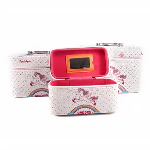 Kuferek wykonany jest z wytrzymałego, sztywnego materiału - doskonale zapewni ochronę przedmiotom znajdującym się wewnątrz. Środek wyściełany miłym w dotyku materiałem. Cały zestaw jest bardzo praktyczny - każdy mniejszy kuferek można schować w środku większego.