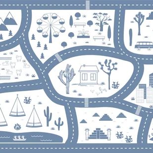 Dziecięcy dywan winylowy Road trip niebieski 100x150 cm - antypoślizgowy dywanik PVC do pokoju dziecięcego, ognioodporny i zmywalny