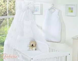 1. Duży baldachim z białego tiulu ze wstawka z bawełny 155x270cm najdłuższy i najszerszy, dzięki czemu można go ładnie ułożyć wokół łóżeczka, ozdobnie pomarszczyć lub nawet umocować na dłuższym boku łóżeczka. Baldachim jest długi niemal do ziemi, poniżej dolnych szczebelków łóżeczka, nie będzie więc wpadał do wewnątrz nawet przy materacu opuszczonym na najniższym poziomie łóżeczka - jak to się niestety często dzieje przy tańszych pościelach, oszczędnie krojonych. Brzegi baldachimu wykończone piękną gładką satynową lamówką. Baldachim Tiulowy wykonany jest z delikatnego i zwiewnego jak chmurka tiulu, wygląda na łóżeczku niezwykle ozdobnie. 2. Dwa wiszące serduszka z miękkim wypełnieniem to słodkie i niepowtarzalne uzupełnienie kompletu pościeli.