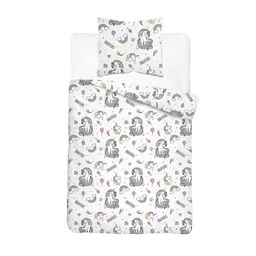 Materiał: 100% bawełna Gramatura: 115 g/m2 Elementy zestawu: poszwa 140x200 cm, poszewka 70x80 cm (1 szt.) Zapięcie: zamek błyskawiczny Ta urocza pościel bawełniana dla dzieci z kolekcji KidsDreams została zaprojektowana z myślą o małych miłośniczkach bajkowych motywów. Wzór jednorożców, tęczy i pastelowych elementów MAGIC wprowadza do pokoju radosny, kreatywny klimat.