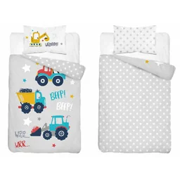 Pościel bawełniana dziecięca dwustronna Auta Budowlane szara to propozycja dla małych fanów pojazdów budowlanych w neutralnej, stonowanej kolorystyce. Wesołe koparki, wywrotki i betoniarki na szarym tle rozweselą wnętrze pokoju dziecka. Wykonana w 100% z naturalnej bawełny, miękka, oddychająca i delikatna dla wrażliwej skóry dziecka zapewnia spokojny sen przez cały rok. W skład kompletu wchodzi: 1 poszwa na kołdrę 1 poszewka na poduszkę Idealna na prezent i do codziennego użytku w dziecięcej sypialni.