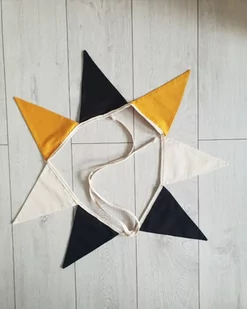 GIRLANDA, proporczyki ozdoba do pokoju dziecięcego Klasyczna girlanda to tekstylna dekoracja pokoju dziecięcego w kształcie trójkąta, zawieszana na sznurku. Standardowo zawieszany jest nad łóżkiem lub łóżeczkiem, można ją przywiązać do szczebli łóżeczka, zawiesić na meblach lub oknie. Można nią ozdobić namioty Tipi oraz baldachim. Do girland idealnie pasują nasze poduszki i maty do zabawy. Dodadzą ciepła i delikatności w pokoju dziecka.