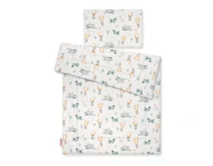 Wzór znajduje się na obu stronach poduszki i kołderki; - wypełnienie poduszki i kołderki z atestowanej włókniny silikonowanej, miękkiej i przewiewnej, o specjalnie dobranej gramaturze, tak by poduszka nie była zbyt gruba (co może być szkodliwe dla niemowląt) a jednocześnie zapewniała optymalną miękkość i sprężystość. Włóknina posiada atest Ökotex - potwierdzający jej najwyższe walory hipoalergiczne i bezpieczeństwo dla Dzieci. Włóknina jest tak dobrana, aby zapewnić najlepsze parametry cieplne, bez ryzyka przegrzania dziecka, a przy tym by była lekka i oddychająca; - Starannie uszyty, z dodatkowym przeszyciem i przepikowaniem, aby komplet nie odkształcał się nawet po wielu praniach; Całość można prać w pralce, komplet szybko schnie i nie zmienia kształtu; Wymiary odpowiednie zarówno do wózka głębokiego, jak i spacerowego, łóżeczka czy też kołyski lub fotelika, tak by łatwo i szczelnie otulić dziecko: