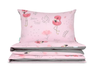 Pastelowa pościel z flamingami do dziecięcego łóżka 100x135 Pościel 100x135 dziecięca różowa Różowy Świat Flamingów z poszewką na poduszkę 40x60 cm to wyjątkowy komplet stworzony z myślą o małych dzieciach i przedszkolakach. Pudroworóżowe tło, urocze flamingi oraz delikatne kwiatowe akcenty tworzą spokojną, bajkową kompozycję, która sprzyja wyciszeniu i komfortowemu zasypianiu. To pościel dziecięca, która pięknie dopełnia wnętrze pokoju dziewczynki i wprowadza do niego lekkość oraz ciepło. Dwustronny wzór – praktyczne rozwiązanie na co dzieńKomplet jest dwustronny – jedna strona zdobiona jest pastelowym motywem flamingów, druga pozostaje gładka w stonowanym, neutralnym odcieniu szarości. Dzięki temu pościel można łatwo odwrócić i dopasować do aranżacji pokoju lub nastroju dziecka.
