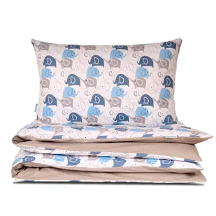 BELLA STORIA DWUSTRONNA POŚCIEL DZIECIĘCA 100x135 WĘDROWNE SŁONIEPościel dziecięca Wędrowne Słonie w rozmiarze 100x135 cm z poszewką na poduszkę 40x60 cm to uroczy zestaw dla wszystkich maluchów, które uwielbiają bajkowe przygody, słoniowe historie oraz przyjazne, pastelowe kolory. Pościel wykonana w 100% z naturalnej bawełny jest miękka, przyjazna dla skóry dziecka i zapewnia wygodę oraz spokojny, zdrowy sen każdej nocy. Dwustronny wzór – słoniowa wyprawa w krainę snów Pościel posiada dwustronny wzór, który umożliwia szybką zmianę aranżacji wnętrza, tworząc w pokoju dziecięcym wyjątkową atmosferę. ✔ Pierwsza strona przedstawia sympatyczne, wędrujące słonie w odcieniach błękitu, granatu oraz szarości, które radośnie podążają jeden za drugim, zabierając malucha w niezwykłą wyprawę do świata wyobraźni. Przyjazny i pogodny wzór rozweseli każde dziecko, zachęcając je do wymyślania własnych bajkowych opowieści.