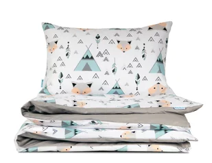 BELLA STORIA DWUSTRONNA POŚCIEL DZIECIĘCA 100x160 LISEK W TIPI Pościel dziecięca Lisek w Tipi w rozmiarze 100x160 cm z poszewką na poduszkę 50x60 cm to wyjątkowy zestaw, który przeniesie Twoje dziecko w świat małych odkrywców i leśnych przygód. Urocze liski, tipi i piórka tworzą przyjazny, ciepły klimat, zachęcając malucha do spokojnego snu i kolorowych marzeń. Pościel została wykonana w 100% z wysokiej jakości naturalnej bawełny – delikatnej, przewiewnej i bezpiecznej dla wrażliwej skóry dziecka. Dwustronny wzór – dwa oblicza przygody Pościel Lisek w Tipi posiada dwustronny wzór, dzięki któremu można w prosty sposób odmienić wygląd pokoju dziecka. ✔ Pierwsza strona przedstawia przyjazne liski, tipi oraz delikatne piórka w pastelowych odcieniach błękitu, szarości i beżu – idealne połączenie dla miłośników spokojnych, naturalnych barw i motywów inspirowanych naturą.