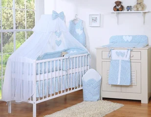 Niepowtarzalny zestaw pościeli 5- elementowej z przepiękną aplikacją serduszek. Nie podrażnia delikatnej skóry dziecka. Wysoki ochraniacz doskonale amortyzuje i ochroni Twoje Maleństwo przed twardymi szczebelkami łóżeczka. Wykonana z trwałej 100% atestowanej bawełny, bezpiecznej dla delikatnej skóry dziecka. W tej pościeli Wasze dziecko będzie spało spokojnie i bezpiecznie.