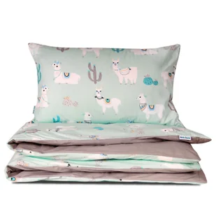 Wszystko to umieszczone zostało na miętowym tle, które dodaje całości lekkości oraz spokoju. Kolorowe detale w odcieniach błękitu, beżu i szarości nadają wzorowi subtelnego uroku. ✔ Druga strona to gładkie, szare tło, stanowiące stonowany kontrast dla barwnej strony z lamami i kaktusami. Dzięki temu pościel można dopasować do różnych wystrojów wnętrza, zachowując przy tym spójny i harmonijny charakter dziecięcego pokoju. Wysoka jakość bawełny – komfortowy sen i trwałość