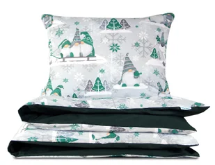 Świąteczna pościel 90x120 niemowlęca szara w Zielone Skrzaty z plecaczkiemNiemowlęca pościel Zielone Skrzaty w rozmiarze 90x120 cm (z poszewką na poduszkę 40x60 cm) otula maluszka miękkością i spokojem zimowego obrazka. Na jasnoszarym tle tańczą śnieżynki, a urocze skrzaty w zielonych czapkach jeżdżą na sankach i machają do małego śpiocha, tworząc radosny, świąteczny nastrój bez krzykliwych kolorów. Dwustronny komplet pozwala w mgnieniu oka zmienić aranżację: wzorzysta strona zdobi łóżeczko, a gładka – w głębokiej, leśnej zieleni – uspokaja całość. Uszyta w Polsce ze 100% naturalnej bawełny o gęstym splocie, jest delikatna dla skóry dziecka, przewiewna i przyjemna w dotyku przez cały rok.