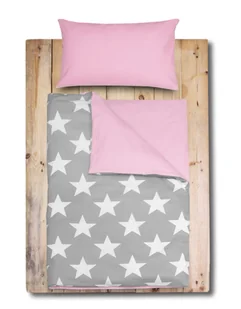 BELLA STORIA POŚCIEL DZIECIĘCA DUALE BABY SZARA W GWIAZDY + RÓŻ 100X135 Z PLECAKO-WORKIEM Komplet pościeli z kolekcji Duale Baby to idealne rozwiązanie dla rodziców, którzy szukają prostego i nowoczesnego rozwiązania do pokoju swojego dziecka. Dwustronna pościel - z jednej strony różowa, z drugiej - szara w gwiazdy jest delikatna w dotyku. Pościel została wykonana ze 100% bawełny - materiał posiada jednorodną powierzchnię i cechuje się wysoką jakością przędz. Możliwość prania pościeli w temperaturze 60°C ułatwia pozbycie się bakterii i drobnoustrojów. DOPASUJ ROZMIAR Standardowo komplet pościeli składa z poszwy na kołdrę w rozmiarze 100x135 cm oraz jednej poszewki w rozmiarze 40x60.