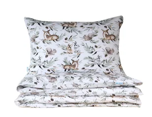 BELLA STORIA POŚCIEL DZIECIĘCA 100X135 SARENKA I PRZYJACIELE Z PLECACZKIEM Pościel dziecięca Sarenka i przyjaciele w rozmiarze 100x135 cm z jedną poszewką w rozmiarze 40x60 cm to idealny wzór dla małych miłośników przyrody. Sarenkę i jej przyjaciół: wiewiórkę i zajączka możemy spotkać na leśnych ścieżkach tylko wtedy, gdy jest cicho i spokojnie - tak, jak podczas błogiego snu. To niezwykle delikatny i subtelny wzór przedstawiający sarenki, wiewiórki i zajączki siedzące na gałązkach. Kolory występujące na niej to brązy, szarości oraz odcienie zielonego.