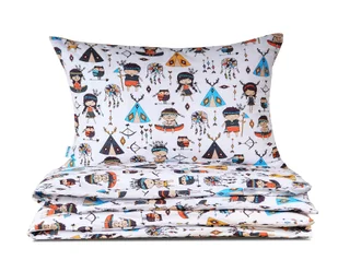 BELLA STORIA POŚCIEL DZIECIĘCA 100X135 MALI INDIANIE Z PLECACZKIEM Pościel dziecięca W indiańskiej wiosce w rozmiarze 100x135 cm z jedną poszewką w rozmiarze 40x60 cm to wyjątkowa propozycja dla najmłodszych poszukiwaczy przygód. Tym razem zaglądamy do wioski indiańskiej pełnej nasyconych, intensywnych barw. Zobaczymy w niej tradycyjne indiańskie namioty, łuki, strzały oraz wielu kolorowo ubranych małych, indiańskich przyjaciół. To doskonały wzór zarówno do pokoju dziewczynki jak i chłopca. Doda energii i nowoczesności w każdym wnętrzu.