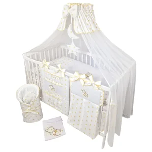 Nasz całkowicie spersonalizowany 14-częściowy zestaw zawiera: 1. 2. poszewkę na poduszkę. 3. 2. poszwa na kołdrę. 4. 2. poduszkę. 5. prześcieradło. 6. 7. gniazdko dziecięce 75x75 cm.