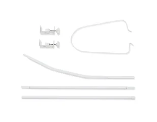 Trzyczęściowy stelaż do baldachimu/moskitiery Solidny stelaż składający się z trzech łączących się ze sobą rurek. Stelaż jest przykręcany do łóżeczka dziecięcego. Umieszczone na nich dwa uchwyty z mocującymi śrubami można dowolnie przesuwać po rurce. Istnieje również możliwość dostosowania do grubości elementów, na których mocowany jest stelaż. Górna rurka łączy się z drutem, na którym umieszczony zostaje baldachim lub moskitiera.