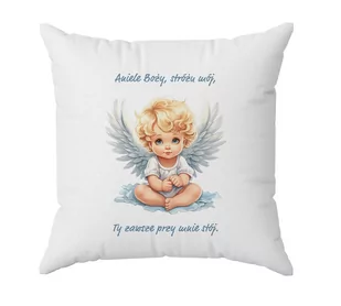 Poduszka dla dziecka z Aniołem i tekstem "Aniele Boży, stróżu mój, Ty zawsze przy mnie stój" to idealny prezent na chrzest, urodziny lub inną okazję. Poduszka jest miękka, wygodna i bezpieczna dla skóry dziecka. Została wykonana z wysokiej jakości materiałów, które są łatwe w praniu i utrzymaniu. Poduszka ma wymiary 40 x 40 cm. Na poduszce widnieje piękny obrazek anioła i modlitwa Aniele Boży, stróżu mój, Ty zawsze przy mnie stój.