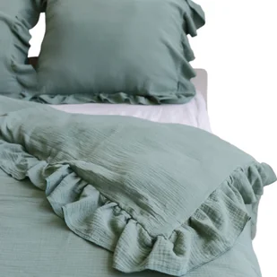 Pościel Muślinowa Z Falbanką Komplet Do Sypialni Boho Zieleń Dziecięca 140X200 Cm + Poduszka 70X80 Cm Pościel muślinowa z elegancką falbanką, stworzona z wyjątkowego materiału muślinowego o najwyższej jakości. Nasze produkty posiadają prestiżowy certyfikat Oeko-Tex 1000 potwierdzający, że nasza pościel jest wolna od szkodliwych substancji chemicznych, co sprawia, że możecie Państwo spać spokojnie, wiedząc, że Wasza pościel spełnia najwyższe standardy jakości. Muślin, z którego wykonana jest ta pościel, charakteryzuje się niezwykłą delikatnością i lekkością. Jest to tkanina oddychająca, co sprawia, że doskonale nadaje się na każdą porę roku, zapewniając uczucie świeżości w ciepłe dni i dostarczając komfortowego ciepła w chłodniejsze noce. Dodatkowo, materiał ten jest przyjazny dla skóry, co sprawia, że pościel muślinowa jest idealna dla osób o wrażliwej skórze.
