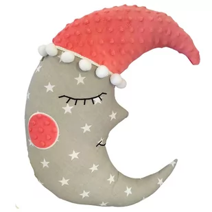 Wymiary poduszki w kształcie księżyca • szerokość około 35 cm • wysokość 45 cm ✔️ Kolor: szara bawełna w białe gwiazdki i pomarańczowa czapka z białymi pomponami ✔️ Oczy i usta są wyhaftowane haftem komputerowym, wysokiej jakości nićmi, nie ma zagrożenia poprucia przy praniu czy użytkowaniu. ✔️ Poliki poduszki są z aplikacji w kolorze czapki nahaftowane na tkaninie. ✔️ Czapka księżyca jest solidnie przyszyta do całości, z tkaniny minky wykończona taśmą z pomponami. Pielęgnacja poduszki.