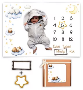 Foto kocyk dziecięcy w pudełku - gotowy na prezent. Fotografuj maleństwo miesiąc po miesiącu, aby stworzyć niezapomnianą pamiątkę na całe życie. Patrz jak Twój maluszek rośnie i ciesz się każdą, drobną zmianą w wyglądzie i umiejętnościach dzieciątka. Starannie wykonany i ozdobiony pięknymi ilustracjami, zachwyci zarówno mamę jak i maleństwo. W zestawie dwie filcowe ramki do oznaczania daty na kocyku.