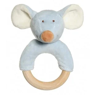 Drewniana grzechotka z uroczą myszką Diinglisar w niebieskim pluszu.
