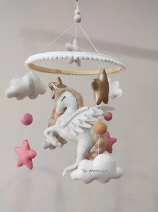 Karuzela handmade dla małej księżniczki z magicznym jednorożcem z rozpostartymi skrzydłami. Jednorożec stoi jakby w ruchu, na tylnych nogach, przednie zadarte do góry. Ma długą grzywę i ogon w kolorze e ...