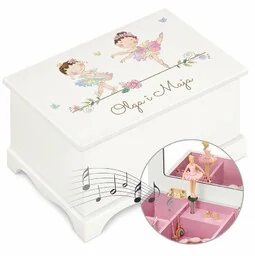 13,5 cm x 18 cm x 10,5 cm kolor szkatułki - biały kolor obicia - różowy materiały - drewno, welur, szkło, metal, tworzywo sztuczne lusterko na pokrywce szkatułki pozytywka - słynny utwór Beethovena pt. : "Dla Elizy" figurka z tańczącą baletnicą podczas grania ponadczasowej melodii gratis nadruk z dedykacją na drewnianej pokrywie szkatułki SZKT-PZT-017