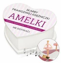 Personalizowana szkatułka z pozytywką dla prawdziwej księżniczki Twoja córka jest jak prawdziwa księżniczka? Wybierasz upominek dla dziewczynki na imieniny ? A może zbliża się Dzień Dziecka ? Spersonalizowana szkatułka w kształcie serca z pozytywką to idealny upominek dla kobiety. W tym białym kuferku przechować można cenną biżuterię, czyli: kolczyki, naszyjniki, łańcuszki, bransoletki i pierścionki. Kuferek z szufladką wzbogacony jest o pozytywkę. Ta wygrywa utwór "Dla Elizy" .