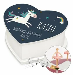 Personalizowana szkatułka z pozytywką dla dziewczynki Ona ma nigdy nie przestawać marzyć? Nie wiesz, co kupić dla dziewczynki na imieniny ? A może zbliża się Dzień Dziecka ? Poszukujesz czegoś dla ukochanej kobiety? Spersonalizowana szkatułka w kształcie serca z pozytywką to idealny upominek dla kobiety. W tym białym kuferku przechować można cenną biżuterię, czyli: kolczyki, naszyjniki, łańcuszki, bransoletki i pierścionki. Kuferek z szufladką wzbogacony jest o pozytywkę. Ta wygrywa utwór "Dla Elizy" .