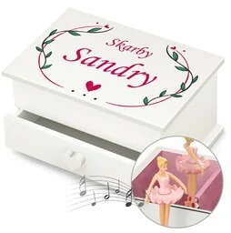 Ta wygrywa utwór "Dla Elizy" . Pozytywka posiada klasyczny mechanizm, który wymaga jedynie ręcznego nakręcenia, aby móc wsłuchiwać się w piękną i przepełnioną spokojem melodię. W trakcie grania utworu, mając w tle praktyczne lusterko , porusza się figurka baletnicy, obracając się niczym prawdziwa tancerka na scenie. Wybierz projekt dedykacji. Dopasuj nadruk z dedykacją , dołączając niezwykłe zdjęcie dziewczynki i stwórz spersonalizowany prezent dla bliskiej kobiety na zbliżającą się okazję .