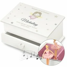 Personalizowana szkatułka z pozytywką i szufladką na chrzest Zastanawiasz się, co kupić dla dziewczynki na chrzest ? Zostaniecie rodzicami chrzestnymi? Wybieracie pamiątkę chrztu dla dziecka ? Poszukujesz czegoś dla kogoś, kto posiada bogatą kolekcję biżuterii? Spersonalizowana szkatułka z pozytywką to idealny upominek dla kobiety. Biała szkatułka ma szufladkę z otwierającą gałką w kształcie serca. Przechować w niej można cenną biżuterię, czyli: kolczyki, naszyjniki, łańcuszki, bransoletki i pierścionki. Kuferek z szufladką wzbogacony jest o pozytywkę.