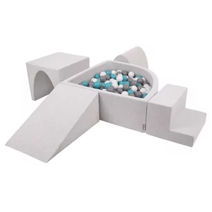 KiddyMoon Piankowy plac zabaw PPZP-TR30D-125 z piłeczkami jasnoszary: szary-biały-turkus basen 200/klin L/górka/tunel/schodek Zabawka plac zabaw