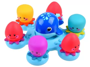 - niebieska platforma - różowy wieloryb z plastiku - 6 kolorowych ośmiorniczek wykonanych z gumy Zabawka pozwoli na radosne pluskanie podczas wieczornych kąpieli, ale także sprawdzi się w basenie lub innym akwenie wodnym.