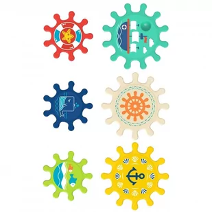 Kolorowe zębatki od marki Woopie to zabawka umilająca dzieciom czas podczas kąpieli. Zestaw składa się z6 kolorowych trybików w dwóch wielkościach. Przyssawki znajdujące się przy każdym trybiku umożliwiają przymocowanie go do płytek, wanny czy prysznica, w taki sposób aby elementy zazębiały się. Dziecko podczas zabawy ruszając jeden element wprawia w ruch całą zbudowaną przez siebie konstrukcję. Maluch bawiąc się poznaje zasadę przyczynowo - skutkową, rozwinie zmysły a kolorowa morska grafika zachęci do zabawy i urozmaici zabawę pod prysznicem lub w wannie.