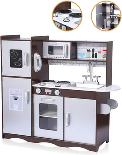 Drewniana kuchnia do zabawy dla dzieci Baby Vivo z tablicą - Toni w kolorze brązowymZabawka i pomoc dydaktyczna w jednym - kuchnia dla dzieciDzieci najlepiej i najszybciej uczą się obserwując i naśladując. Kuchnia do zabawy dostosowana do ich wielkości z pasującymi akcesoriami pozwala im naśladować czynności dorosłych i uczyć się przez całe życie poprzez zabawę. To, czy wybrana w tym celu kuchnia dla dzieci jest wykonana z nowoczesnego, łatwego w pielęgnacji plastiku, czy klasycznie zaprojektowanego drewnianego modelu, zależy od osobistych upodobań. Ważne jest, aby kuchnia do zabawy spełniała swoją nazwę i zachęcała maluchy do naśladowania rzeczywistych zadań związanych z przygotowywaniem i gotowaniem wykonywanych przez dorosłych. Idealnie byłoby, gdyby zakupiona w tym celu zabawka była podobna do urządzeń znajdujących się w "prawdziwej" domowej kuchni.