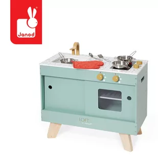 Janod Kitchen Loft Poznaj tę piękną drewnianą kuchnię loftową z akcentami w stylu vintage. Twoje dziecko będzie się świetnie bawić dzięki wielu funkcjom i akcesoriom, które ta kuchnia ma do zaoferowania. 1 zlewozmywak, 1 płyta grzewcza z nadrukiem, pokrętła obrotowe z dźwiękiem, 2 drzwi przesuwne do piekarnika i spiżarni. Wewnątrz: 1 półka do przechowywania 7 metalowych przedmiotów (1 szpatułka, 1 łyżka do makaronu, 1 chochla, 1 łyżka cedzakowa, 1 durszlak, 1 rondel, 1 patelnia) i materiałowa rękawica. Idealny do stymulowania wyobraźni dziecka.