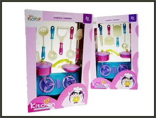 Zestaw zawiera kuchenkę dwupalnikową 149x12x5cm , dwa garnki o średnicy 6-7cm oraz sztućce kuchenne : szumówka , łyżka wazowa , obierak , nóż do sera i inne .