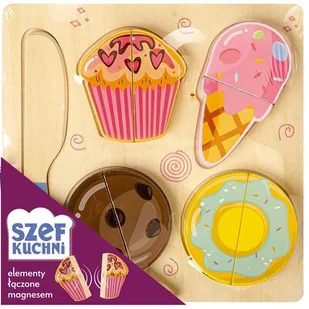 Zestaw "Szef kuchni" rozwija wyobraźnię, kreatywność oraz motorykę dziecka. Zabawa zestawem daje możliwość poznania kolorowych przekąsek, zachęcając do gotowania. Wszystkie elementy wykonane są z drewna, pokryte bezpieczną dla dzieci farbą. Elementy połączone magnesem.